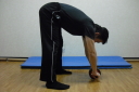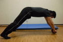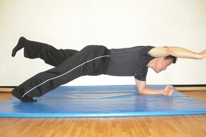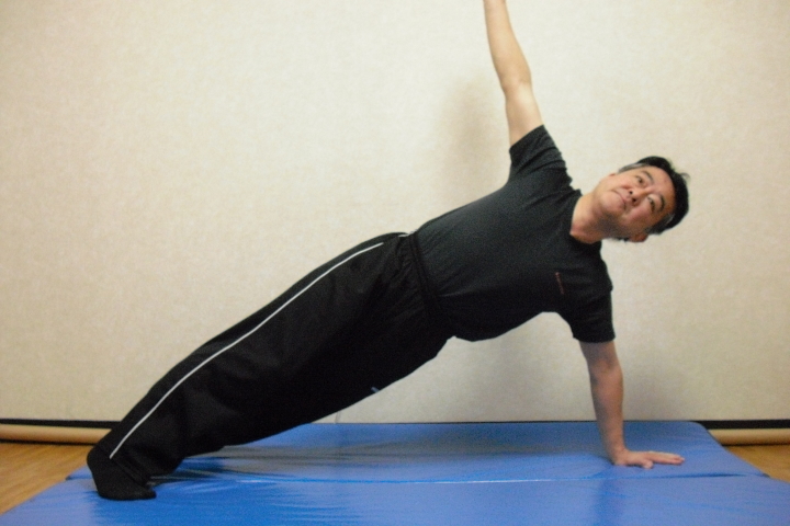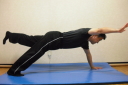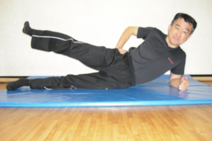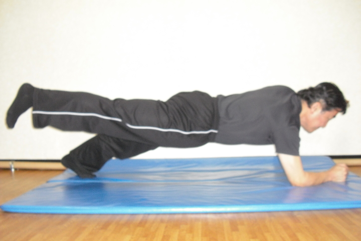 コアトレーニングの基本はサイドブリッジとフロントブリッジです。写真は腰を落としての股関節運動と膝を上げたフロントブリッジです。