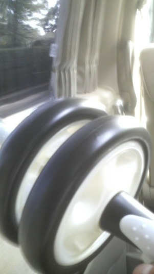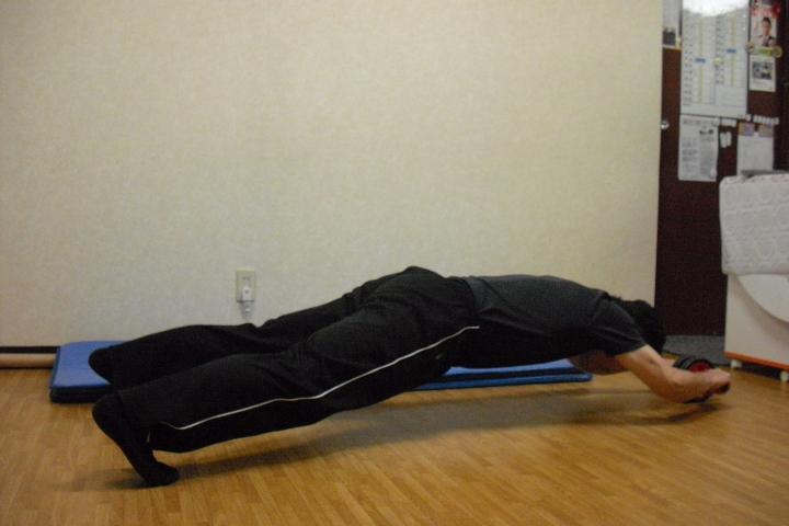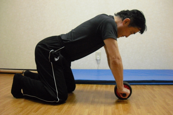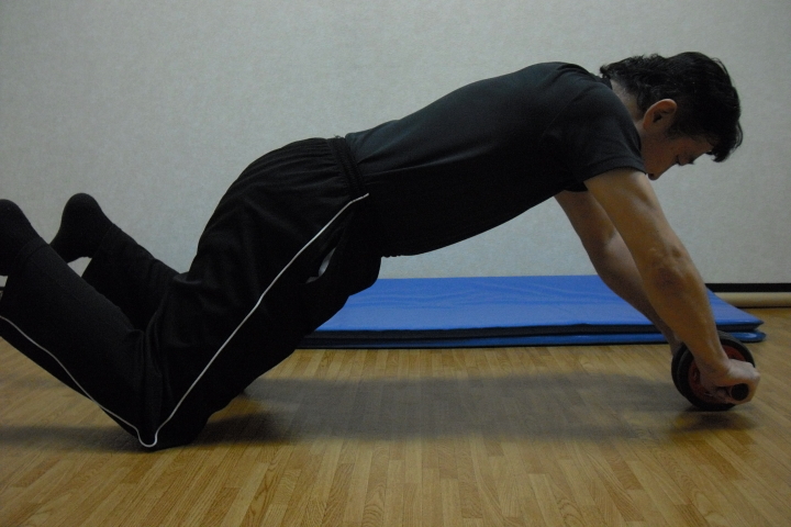 写真は中程度の大きさの「腹筋ローラー」を使いつま先立ちでのトレーニングです。